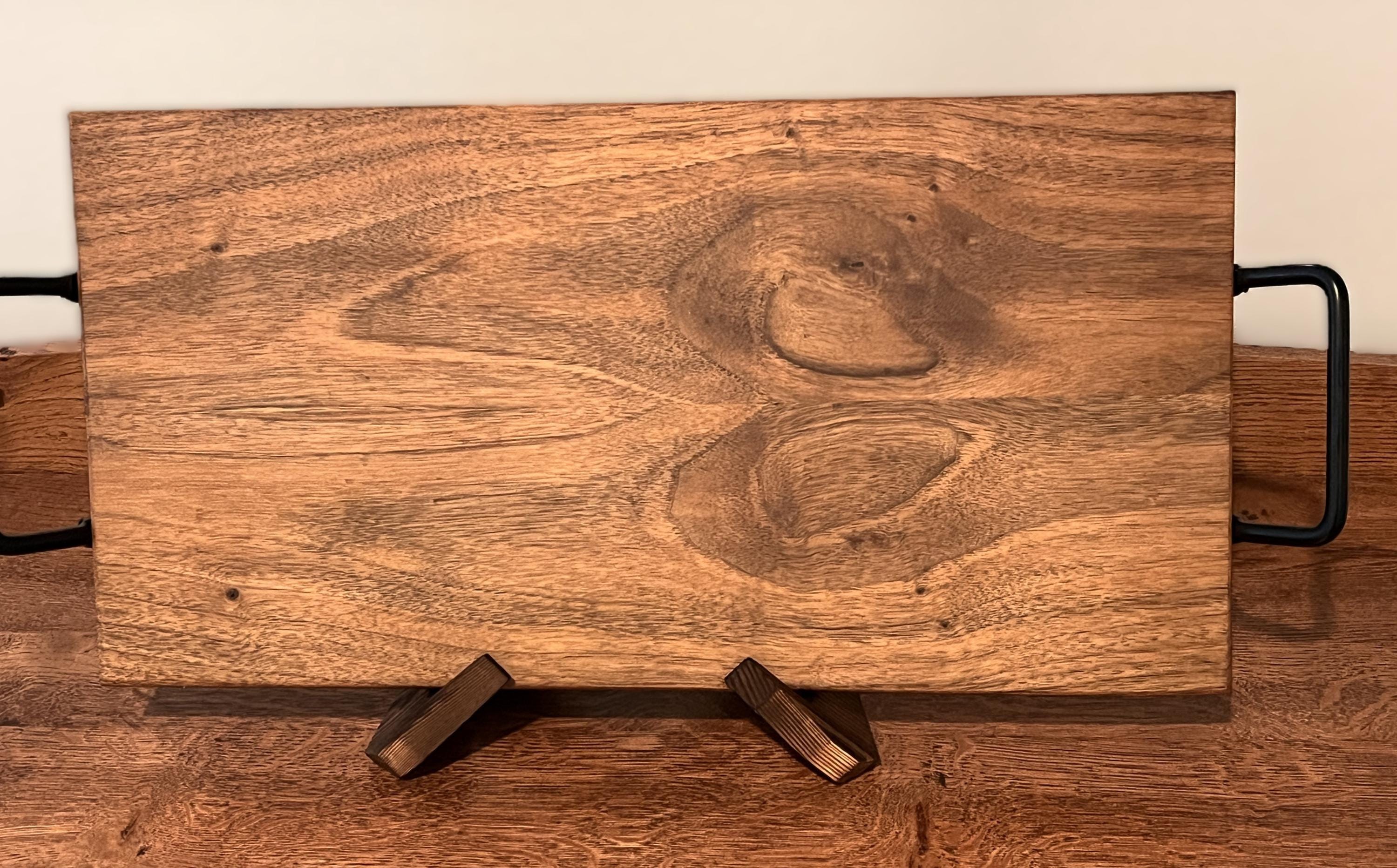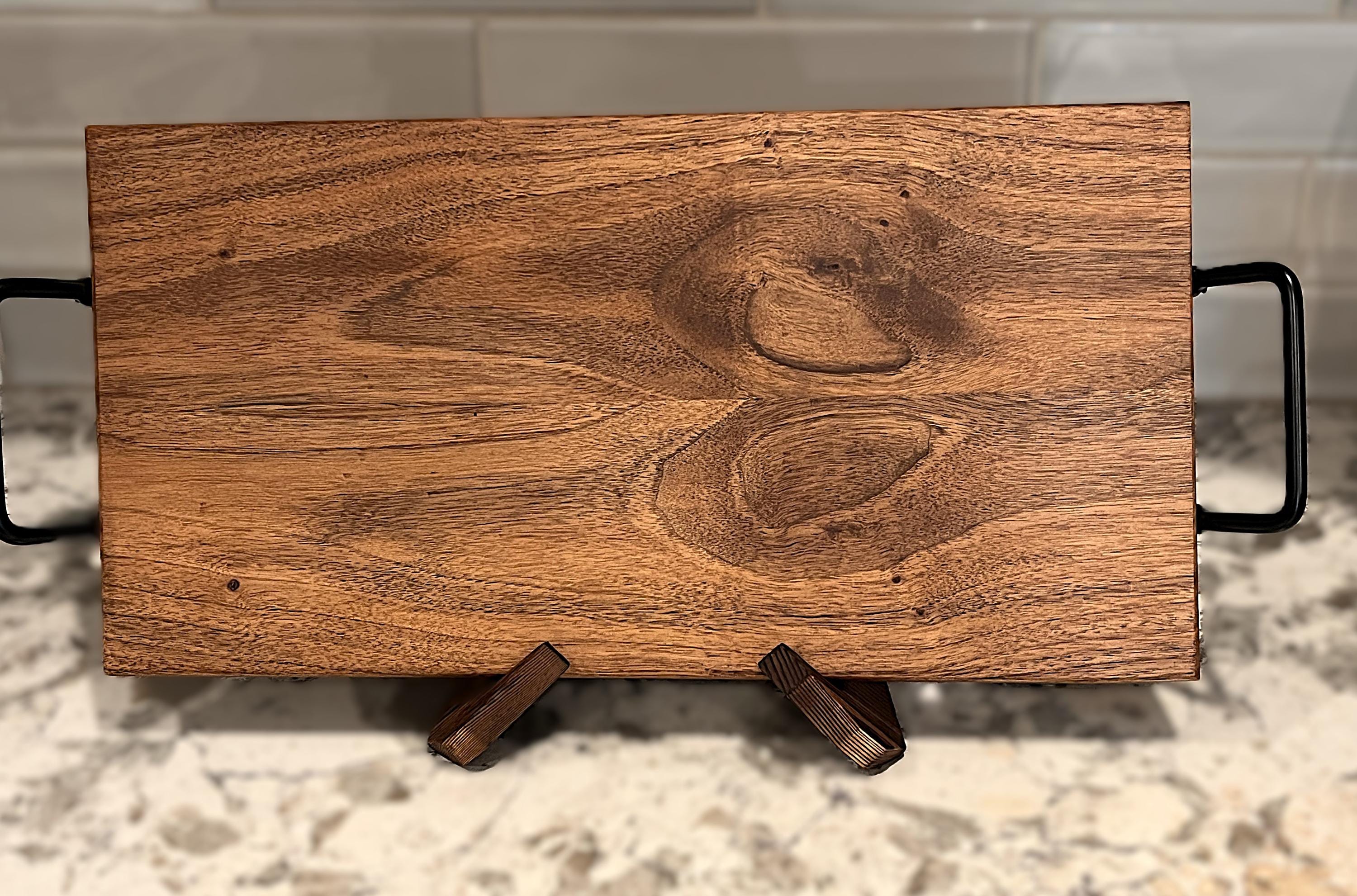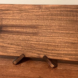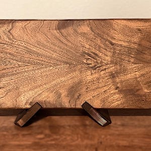 One of-a-kind solid walnut charcuterie serving board. See the photo showing the book matching technique. The board you see is the board you get. Every board I make is presented separately. With shipping included with the price you know exactly what you are purchasing and the price you will pay. Boards can also be used as an ottoman tray to display candles and decorative objects. Can also be used as an "art piece" resting on a plate holder in the kitchen and keeps the board dry and also prevents the board from possible damage. Note: If provided, handles are connected to the ends of the board to make cleaning the flat surface easier. Food and debris cannot surround and gum-up the handles.