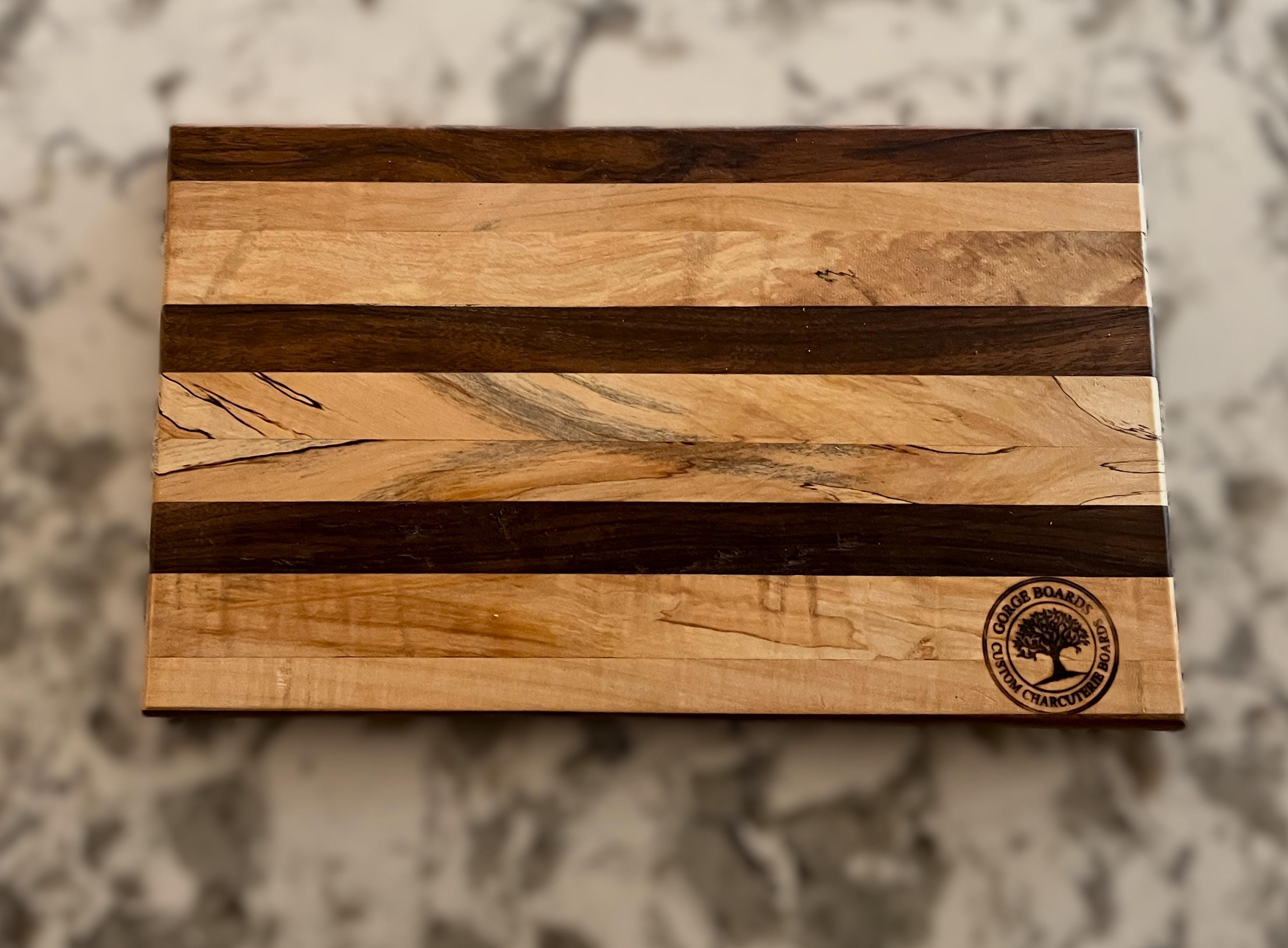 One of-a-kind solid strips of walnut and maple charcuterie serving board with beautiful grain patterns. The board you see is the board you get. Every board I make is presented separately. With shipping included with the price you know exactly what you are purchasing and the price you will pay. Boards can also be used as an ottoman tray to display candles and decorative objects. Can also be used as an "art piece" resting on a plate holder in the kitchen and keeps the board dry and also prevents the board from possible damage. Note: If provided, handles are connected to the ends of the board to make cleaning the flat surface easier. Food and debris cannot surround and gum-up the handles.